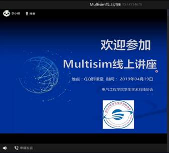 作为电气工程专业必备的软件之一,Multisim电路仿真模拟软件使同学们可以在电脑上进行电路仿真实验,促进理论知识的理解与验证,在双创活动中发挥巨大的作用,学好这个软件的应用对同学们的学习至关重要,为满足同学们的学习需求,yl23455永利官网学生学术科技协会特邀请学院李小根老师为同学们开设Multisim线上特色讲座。2020年4月19日下午三点,讲座在QQ群课堂在线顺利进行,本次讲座深受学生欢迎,除了yl23455永利官网的同学以外,还有来自空天、机械等学院的211名同学参加。