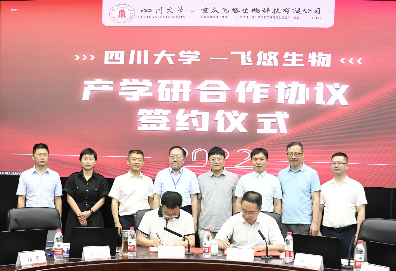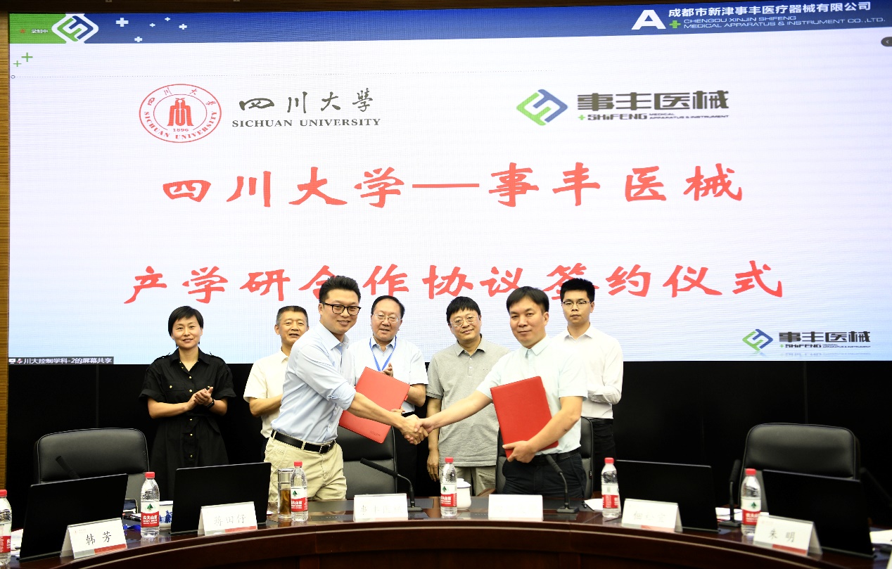 在与会领导和专家的见证下,yl23455永利官网自动化系党支部书记刘念和系主任佃松宜代表学院分别与重庆飞悠生物科技有限公司董事长邵文陶和成都市新津事丰医疗器械有限公司运营副总经理石明阳签订了产学研合作协议。