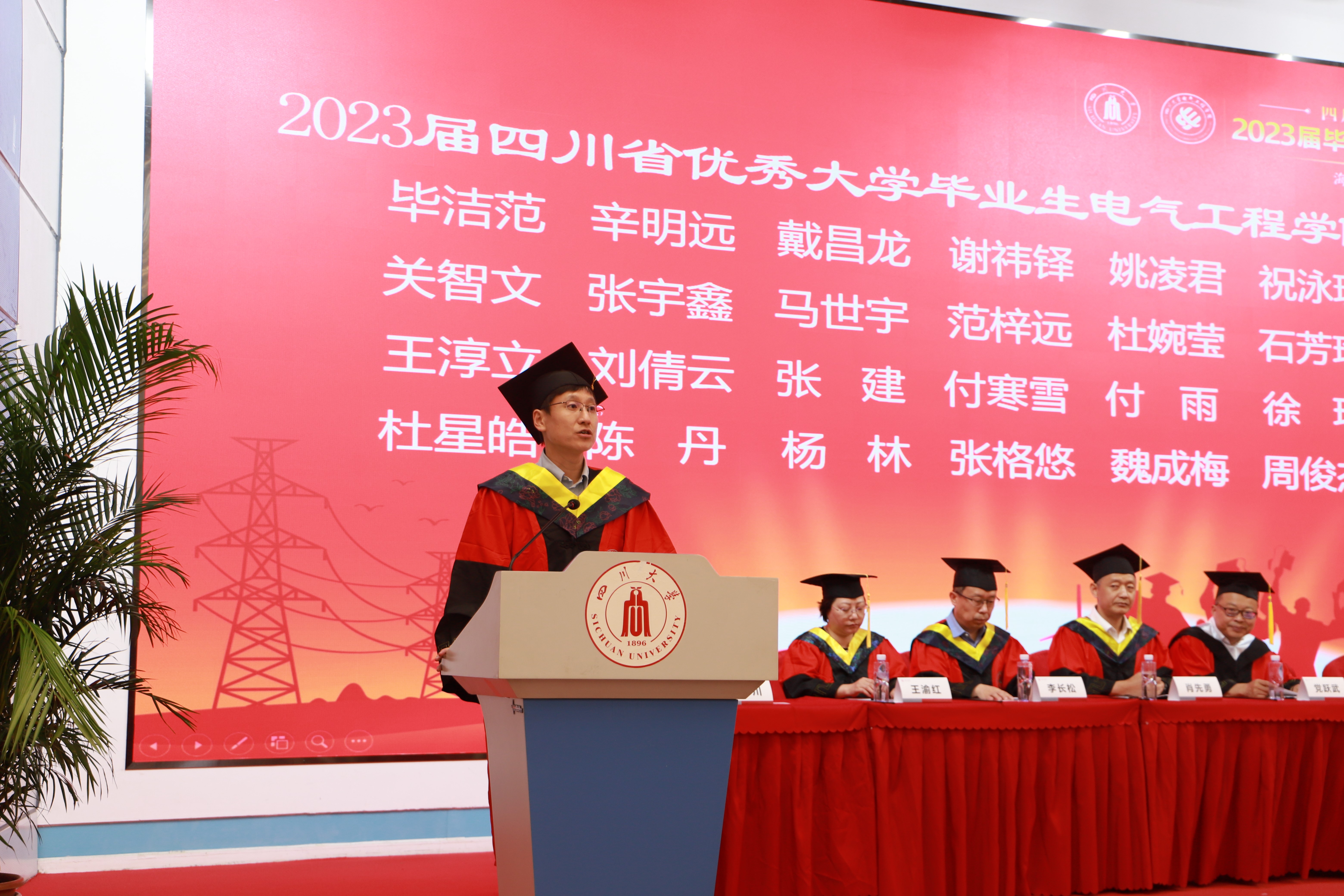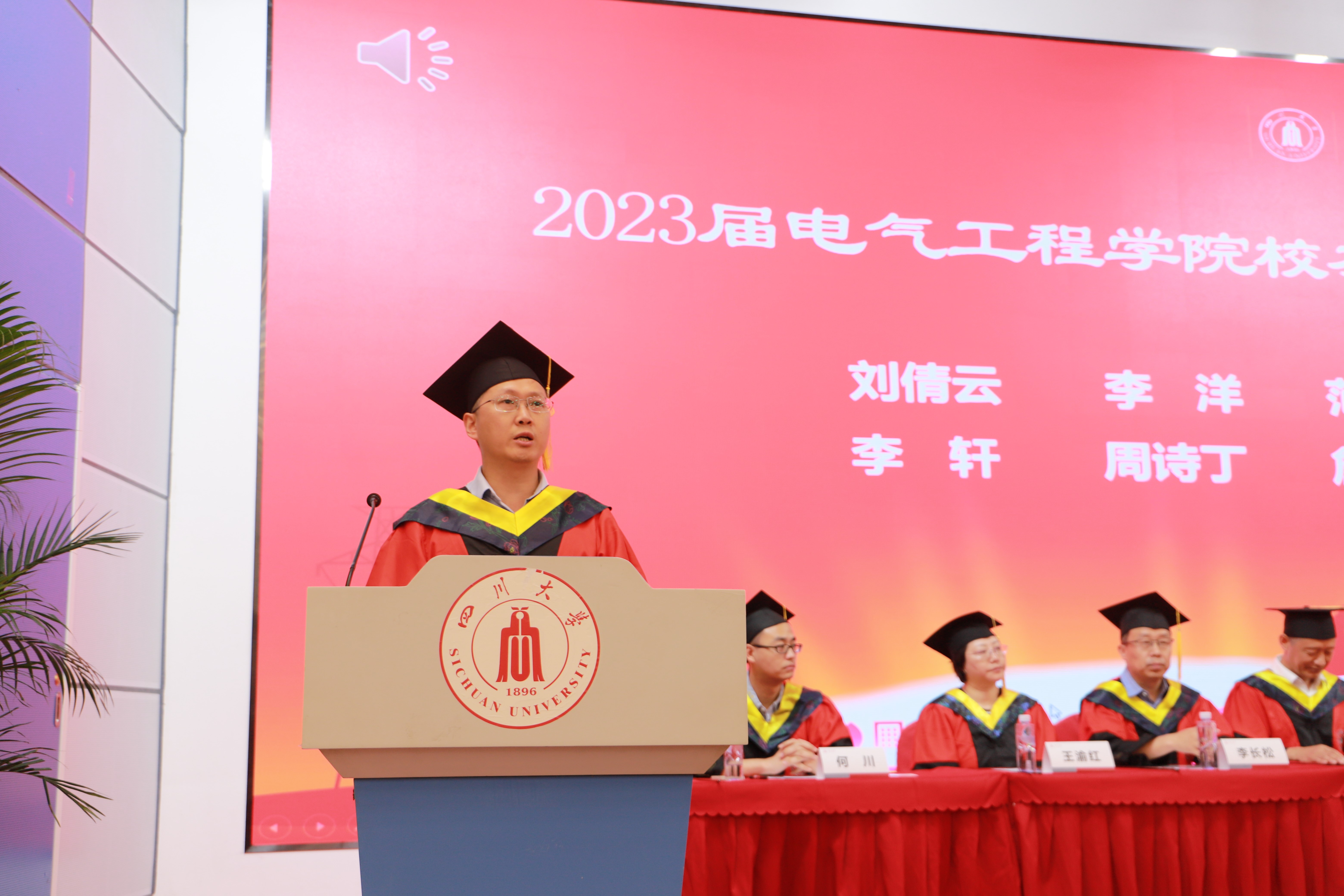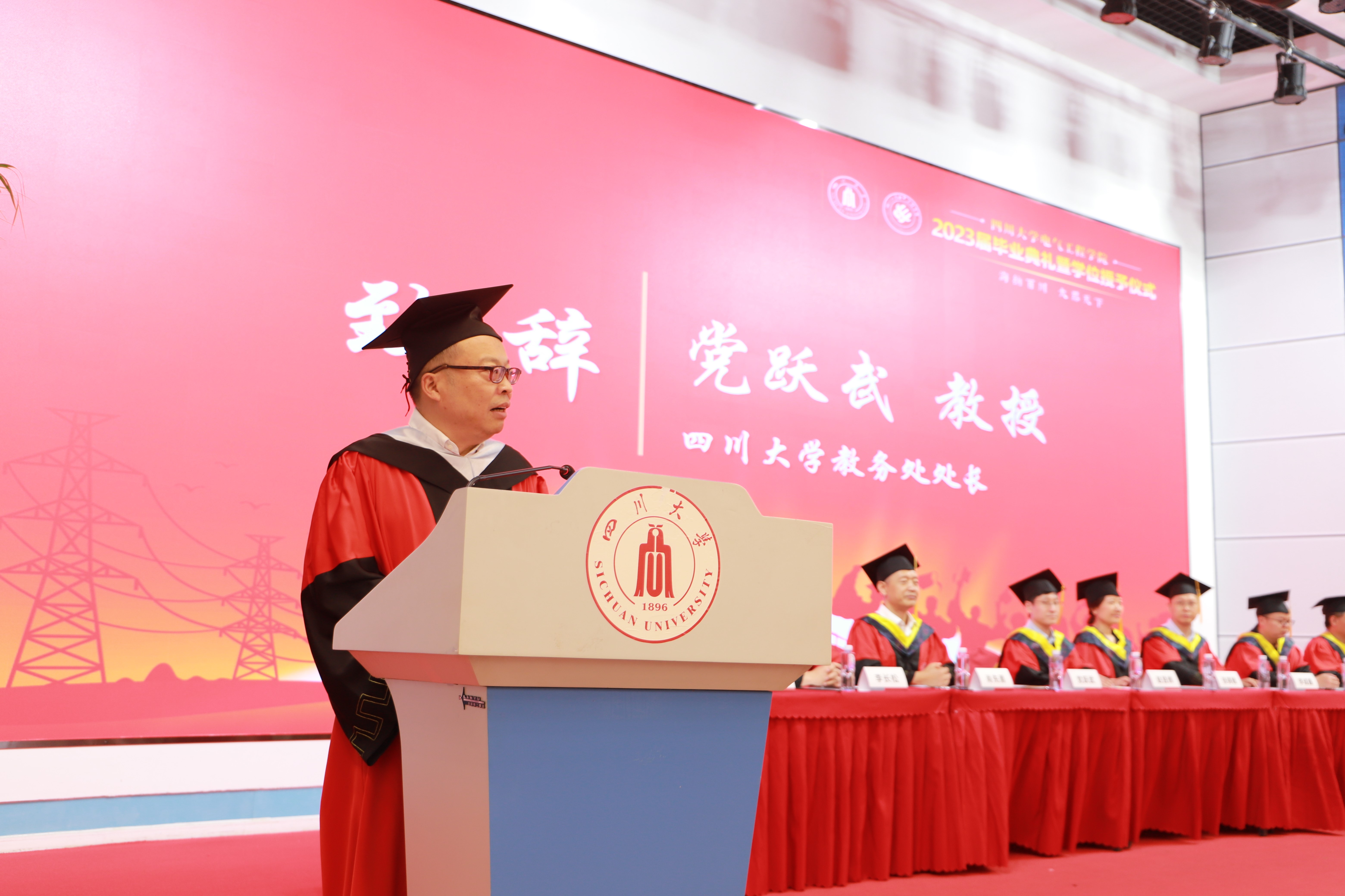 学校教务处处长党跃武发表致辞。他首先向2023届yl23455永利官网的全体毕业生顺利完成学业、走上新的人生征程表示祝贺。他以川大老校长任鸿隽先生1937年毕业典礼训词中“忠于所学”“有所不为”“继续求学”三句话来勉励同学。他说,忠于所学就是要有心怀国之大者的光荣使命,有所不为就是要有以人民为中心的价值准则,继续求学就是要有把本领学到手的成才境界。他希望每位电气毕业生都要把川大的精神带出去,把川大的味道留身上,奔向五湖四海,融入星辰大海。在新时代的新征程上,一起努力奋进,一起爱党爱国爱川大,永远为伟大祖国雄起,永远为四川大学扎起,地负海涵,直挂云帆!