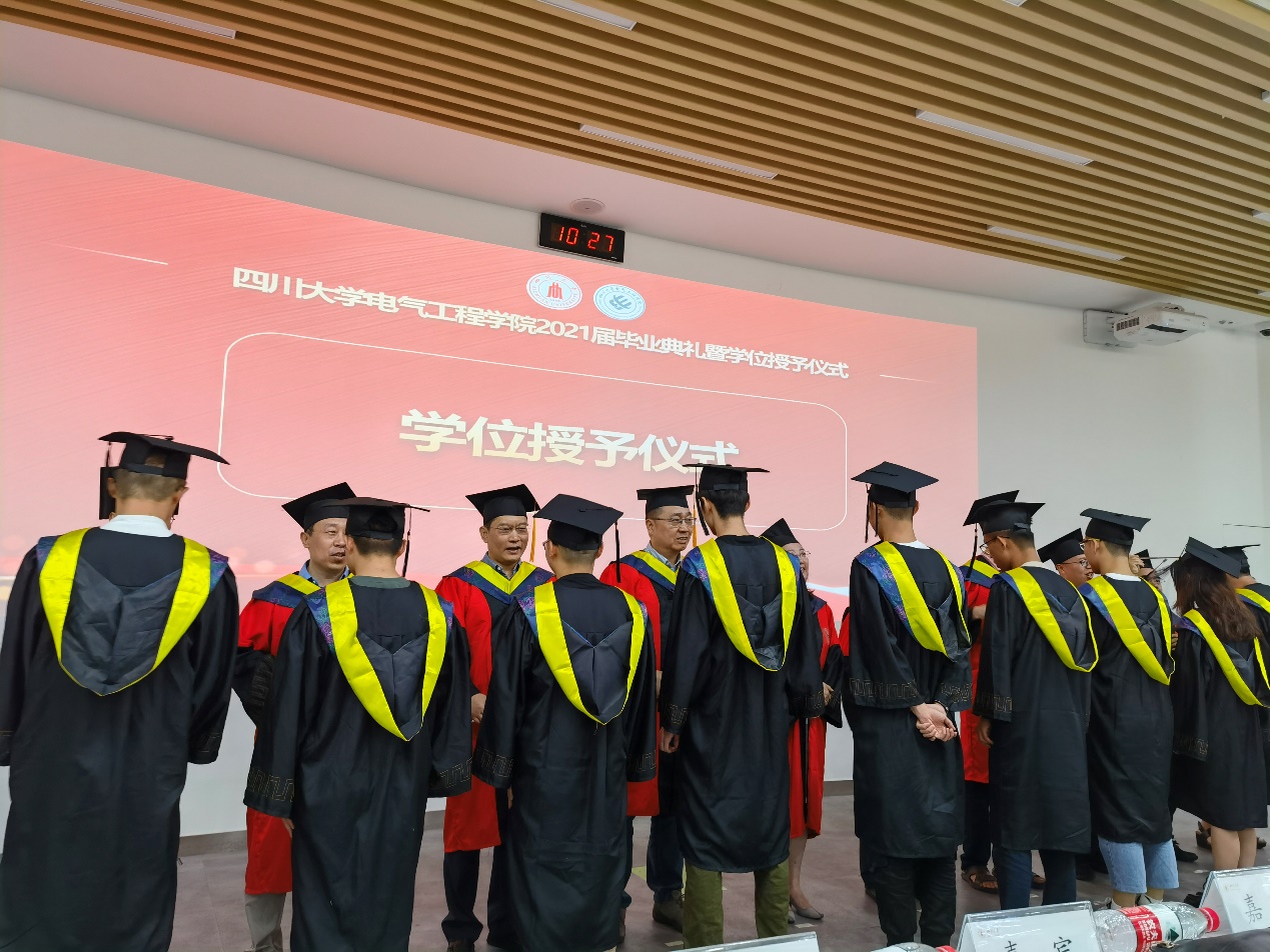 在热烈的掌声中,肖先勇院长向全体2021届毕业生致以最诚挚的祝贺,并作了题为《秉持科学精神,拥抱美好时代,建设伟大祖国》的毕业寄语。肖院长对同学们提出三点希望:一是秉持科学精神,胸怀祖国,服务国家。作为我们国家实现第二个百年奋斗目标的建设者、见证者,同学们需要具有新时代大学生的社会责任和担当。二是拥抱美好时代,抓住机遇,成就人生。肖院长鼓励同学们积极培养应对复杂环境的决心和能力,把握“变局”,始终坚信这个时代必将更加美好。三是建设伟大祖国,顶天立地,大器天下。肖院长勉励同学们成为具有家国情怀、创新能力的优秀人才,把自己在川大学到的本领用于建设伟大祖国。他希望所有川大电气学子,都能在时代前进潮流中把握主动、赢得发展;在实现伟大梦想中乘势而上、笃定前行。最后,肖院长祝全体毕业生前程似锦,欢迎同学们常回“家”看看。