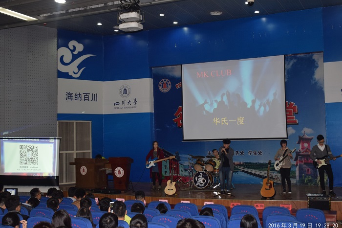 晚上7:20,本次活动正式拉开帷幕。首先,华氏一度成员为我们带来一场视听盛宴,吉他、贝司、架子鼓与人声丝丝入扣,震撼全场。在华丽的表演后,主持人宣布本次活动正式开始,观众们激情高涨。在热烈的气氛中,华氏一度核心成员——何亮为我们亲切地介绍了乐队成员和乐队的发展经历,并由乐队的架子鼓手焦星宇和潇洒的吉他手们带来完美表演。