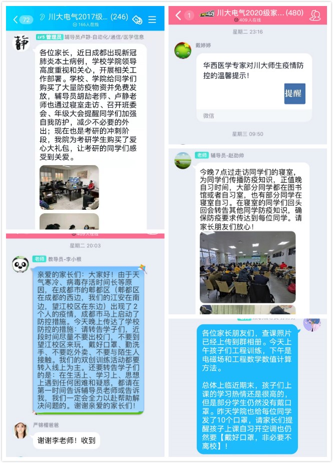此外,学院注重家校联动,辅导员用活用好各年级家长群平台,及时通报成都最新疫情,传达学校学院各项防疫工作的开展情况,让远在外地的学生家长安心、放心。