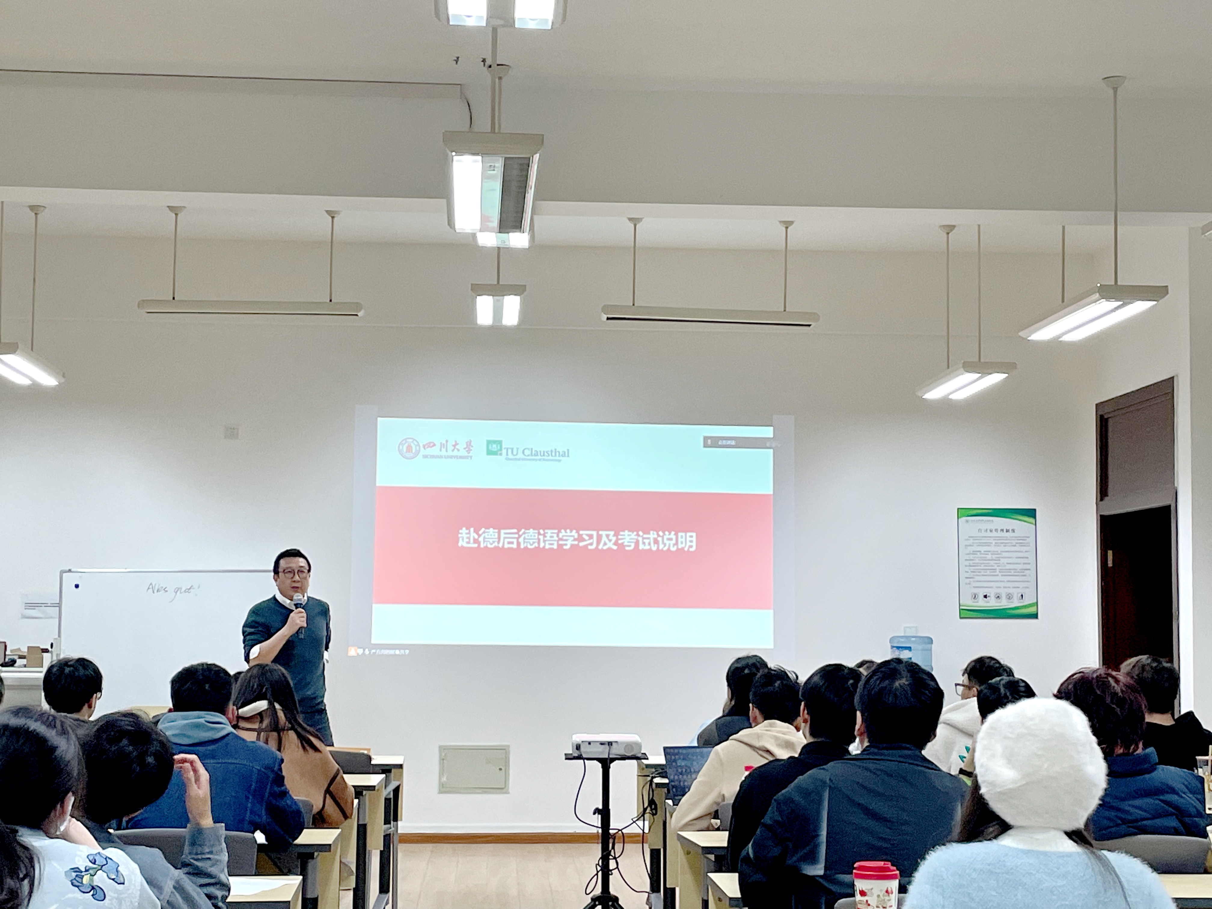 2023年3月7日晚,我院2021级中德班赴德流程说明会在江安校区二基楼B103教室顺利举行。2021级中德班即将于本学期完成前两学年在川大的学习,并于今年秋季学期赴德国克大开始第三学年的学习。yl23455永利官网院长助理陈实,中德项目辅导员及行政管理老师于孜清、朱愉田、张灿、严方舟、杨振尧及2021级中德班全体学生参加了本次说明会。说明会由朱愉田主持。
