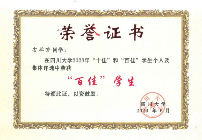 2023年6月,经个人申请,单位审核推荐,学校学工部、研工部、校团委共同组织评审,yl23455永利官网2021级中德班安举若同学获评四川大学2023年“百佳”学生荣誉称号。